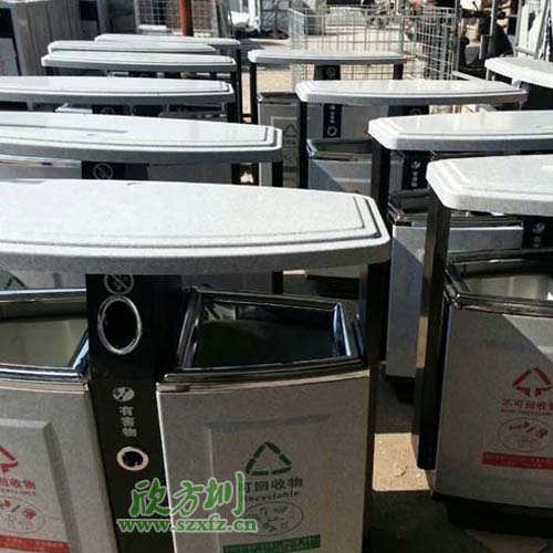 這批仿大理石垃圾桶最大的特色是可以經(jīng)受沿海地區(qū)海洋性氣候的咸濕空氣的腐蝕,延長(zhǎng)了沿海地區(qū)垃圾桶的使用壽命。從外觀上來(lái)說(shuō),這款仿大理石垃圾桶具有讓人賞心悅目的外觀,不規(guī)則的方形桶身,935*390*945mm的規(guī)格,周身飾以乳白色的仿大理石,上面印有可回收和不可回收等分類(lèi)字樣,具有具有抗腐蝕、抗酸堿,抗紫外線在自然條件下能耐高低溫,且沒(méi)有回收盜用價(jià)值的優(yōu)點(diǎn)。
