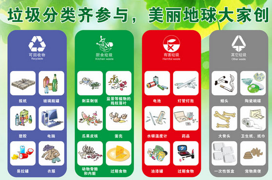 (5)布料:主要包括廢棄衣服、桌布、毛巾、布包等 如每回收1噸廢紙可造好紙850公斤,節(jié)省木材300公斤,比等量生產(chǎn)減少污染74%;每回收1噸塑料飲料瓶可獲得0.7噸二級原料;每回收1噸廢鋼鐵可煉好鋼0.9噸,比用礦石冶煉節(jié)約成本47%,減少空氣污染75%,減少97%的水污染和固體廢物。 可回收物以外的垃圾基本上都是廢棄物。比如煙頭、雞毛、廢電、煤渣、建筑垃圾、油漆顏料、食品殘留物等等。 有毒垃圾,包括廢電池、日光燈管、水銀溫度計(jì)、油漆筒、藥品、化妝品等。 垃圾是放錯了地方的財富。