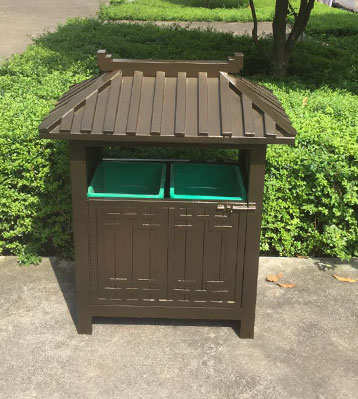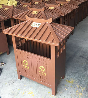 欣方圳景區(qū)古典鋼制分類(lèi)垃圾桶戶外擺放圖