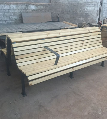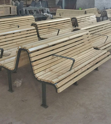 公共場所鋼制靠背防腐木休閑椅椅面原材料采用真空泵排除空氣、填充防腐液、加壓滲透、抽真空排出多余防腐液達到先進的防腐防蟲工藝。